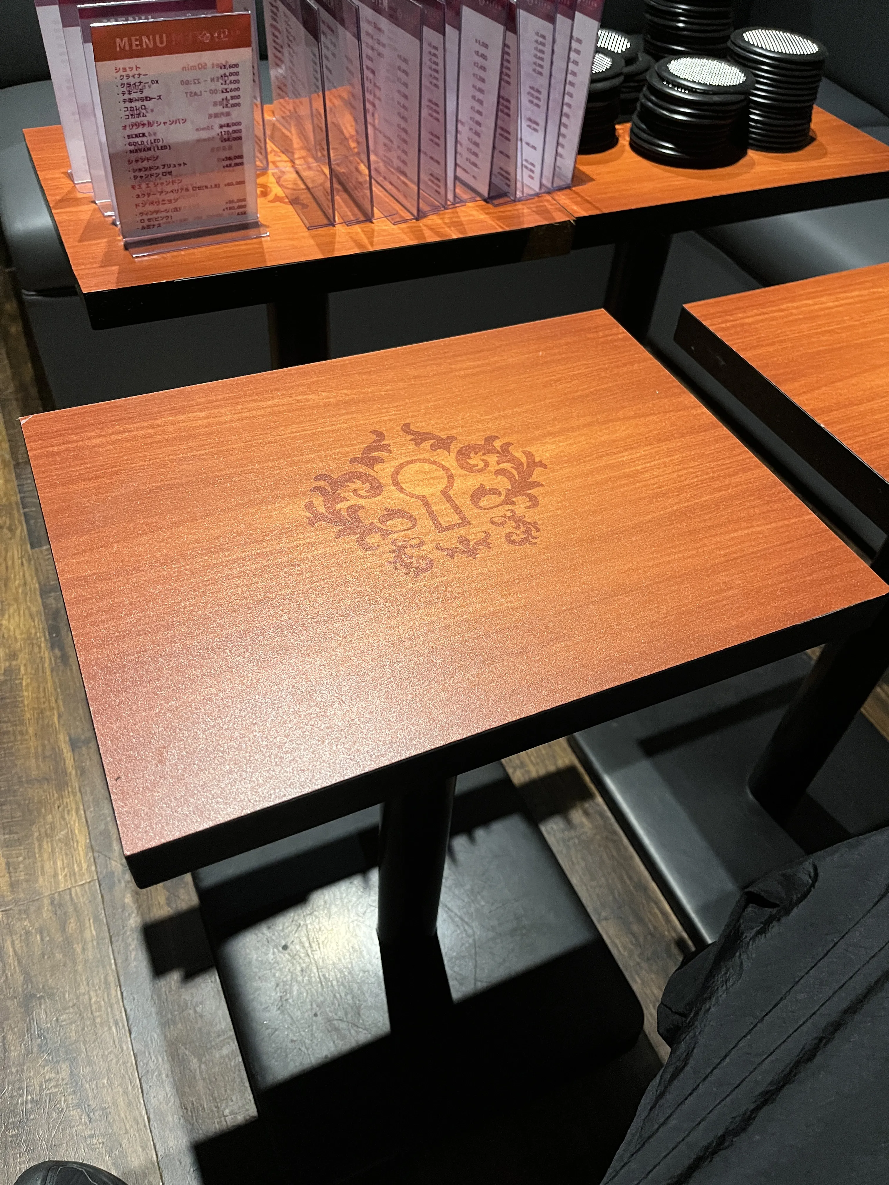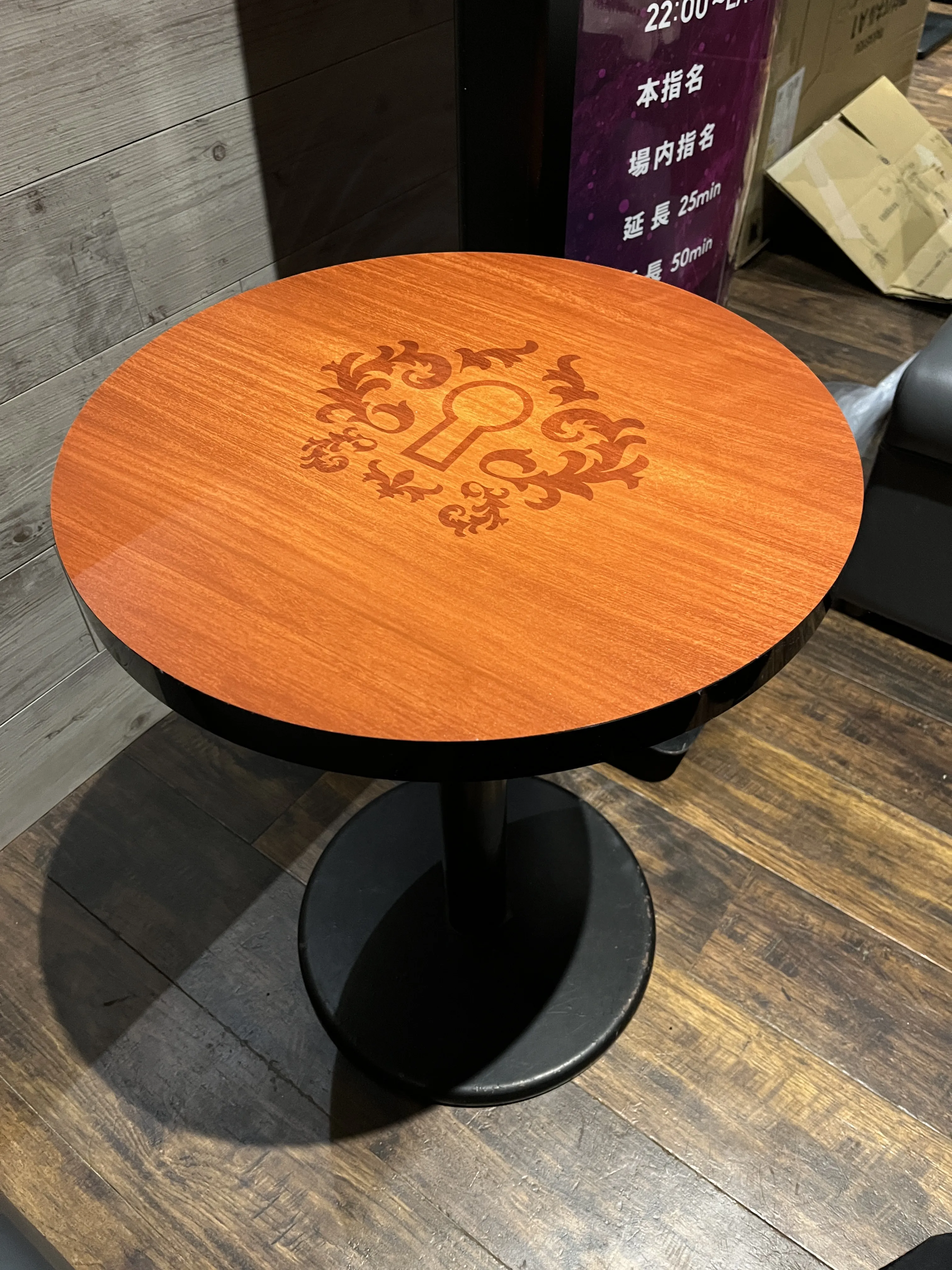 木目調で温かみのあるデザイン 木目調で温かみのあるテーブルにロゴを印字して仕上げる事で高級感のある中に親しみを感じられる店舗の雰囲気にふさわしいデザインに仕上げました。
